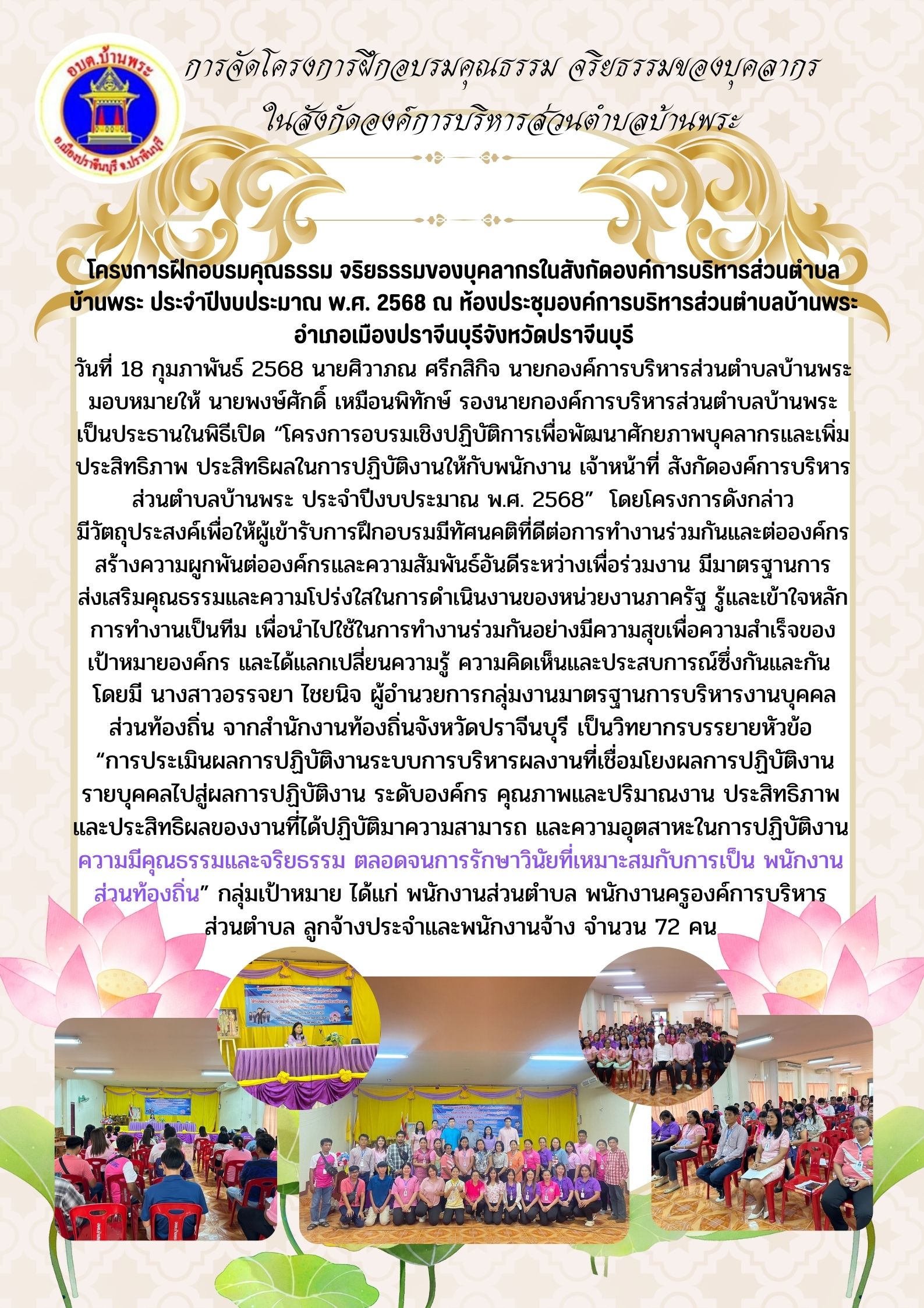 การจัดโครงการฝึกอบรมคุณธรรม จริยธรรมของบุคลากรในสังกัดองค์การบริหารส่วนตำบลบ้านพระ ประจำปี 2568 |