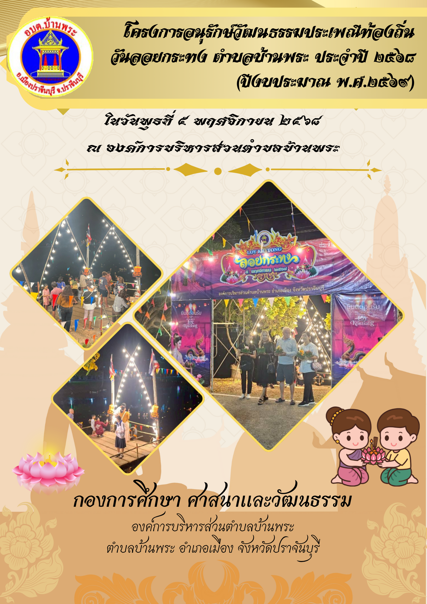 กองการศึกษา ศาสนาและวัฒนธรรม องค์การบริหารส่วนตำบลบ้านพระ ได้จัดโครงการอนุรักษ์วัฒนธรรมประเพณีท้องถิ่นวันลอยกระทง ตำบลบ้านพระ ประจำปี 2568 (ปีงบประมาณ พ.ศ. 2569) ในวันที่ 5 พฤศจิกายน 2568 ณ องค์การบริการส่วนตำบลบ้านพระ ตำบลบ้านพระ อำเภอเมือง จังหวัดปราจีนบุรี เพื่อปลูกจิตสำนึกให้เด็ก เยาวชน ประชาชน ได้รู้จักร่วมกันอนุรักษ์และสืบสานวัฒนธรรมประเพณีลอยกระทงให้คงอยู่คู่ท้องถิ่น สร้างความปรองดอง สมานฉันท์และคืนความสุขให้ประชาชนในท้องถิ่นและใกล้เคียง และความสัมพันธ์อันดีระหว่างชุมชน ประชาชน ผู้สูงอายุ ผู้นำชุมชน เด็กและเยาวชน สามารถนำหลักธรรมมาปรับใช้ในการดำเนินชีวิตประจำวัน ให้เป็นคนดี มีคุณธรรม เสริมสร้างให้ชุมชนอยู่เย็นเป็นสุขอย่างยั่งยืน